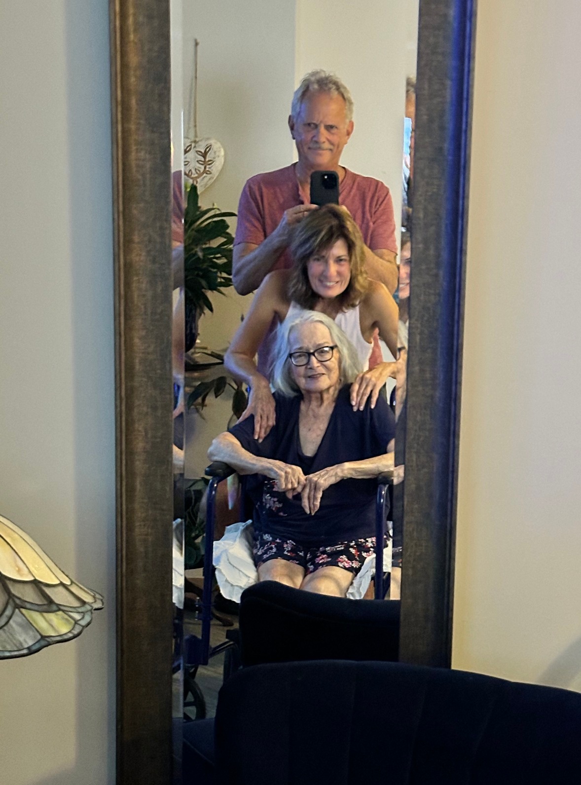 Last night as I was telling Mom I loved her, I saw our reflection in the mirror. I liked it and asked John to join us and take a photo. Life is way cool. And I am way grateful to be living this kind of love. Mom is, too. When I told her that I loved her from a purer place than I ever had, she said, “And vice versa.” She paused and then said, “Now, about the hoot owl?” That’s a private joke and another story, another memory.